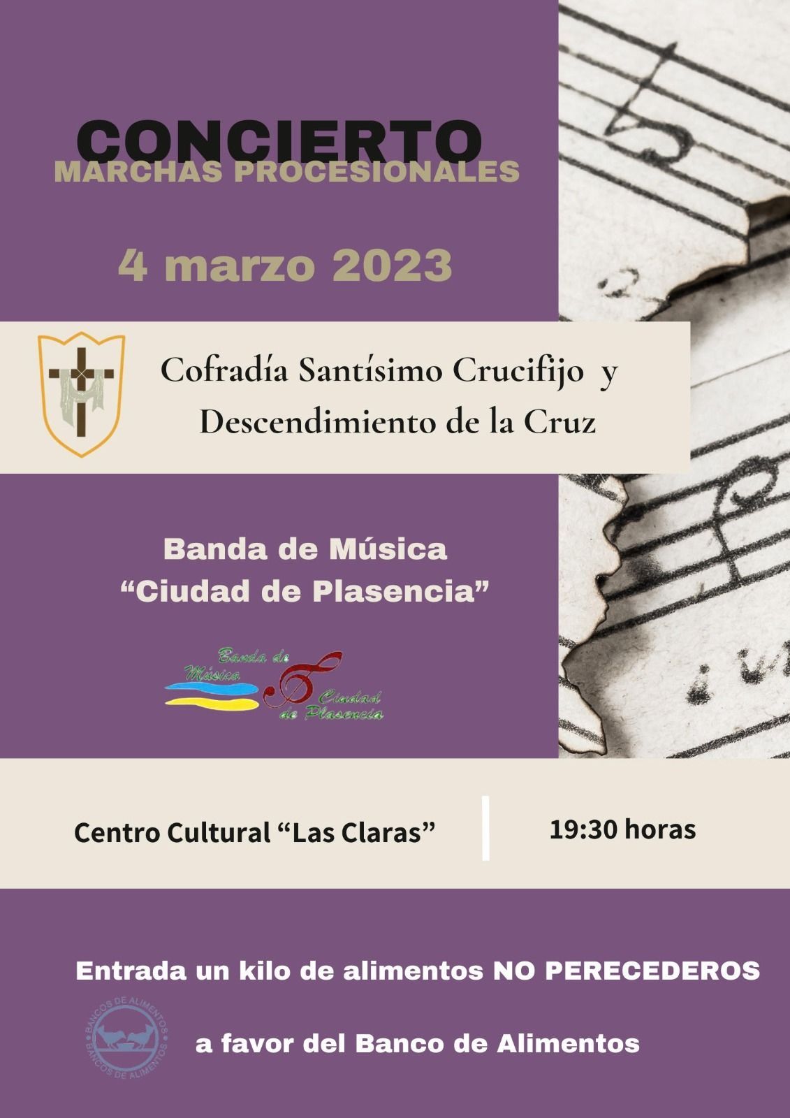 Mañana, día 4 de marzo a partir de las 19:30 horas, tendrá lugar en el Centro Cultural "Las Claras" de Plasencia el Concierto de Marchas Procesionales organizado por nuestra cofradía.