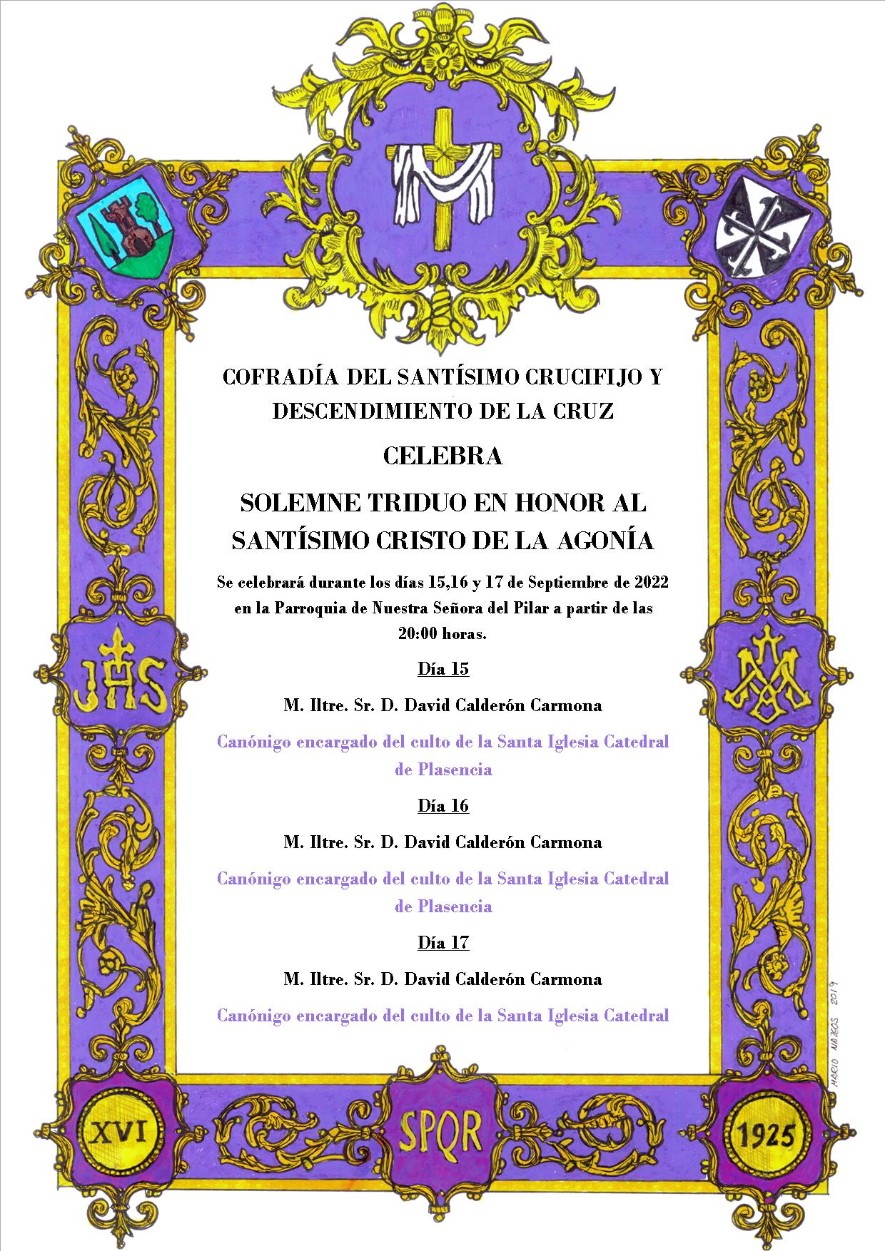 Durante los días 15,16 y 17 de septiembre se celebrará en la Parroquia de Nuestra Señora del Pilar el Solemne Triduo en honor al Santísimo Cristo de la Agonía.