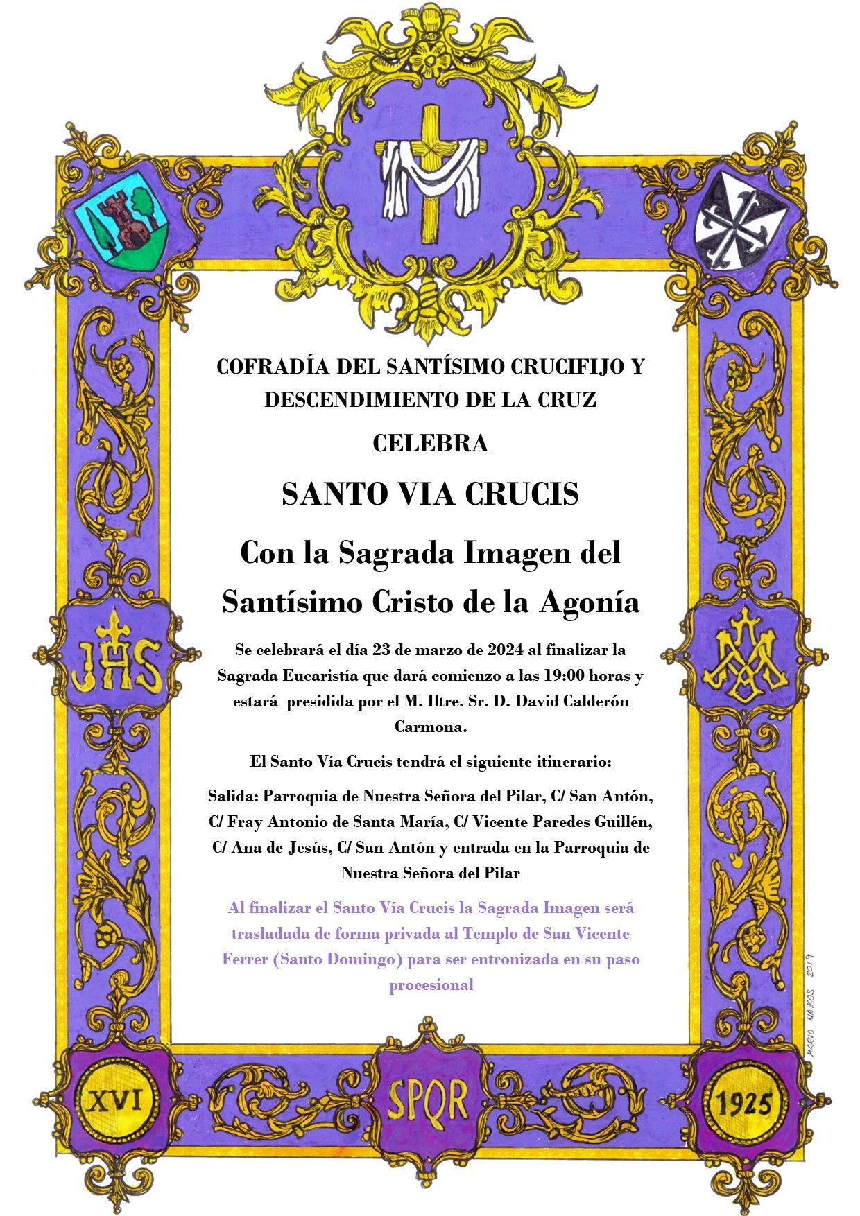 Mañana, día 23 de marzo, Sábado de Pasión, en la Parroquia de Nuestra Señora del Pilar, celebraremos el acto de Piadoso Vía Crucis por las calles de la feligresía con nuestro Sagrado Titular el Santísimo Cristo de la Agonía.